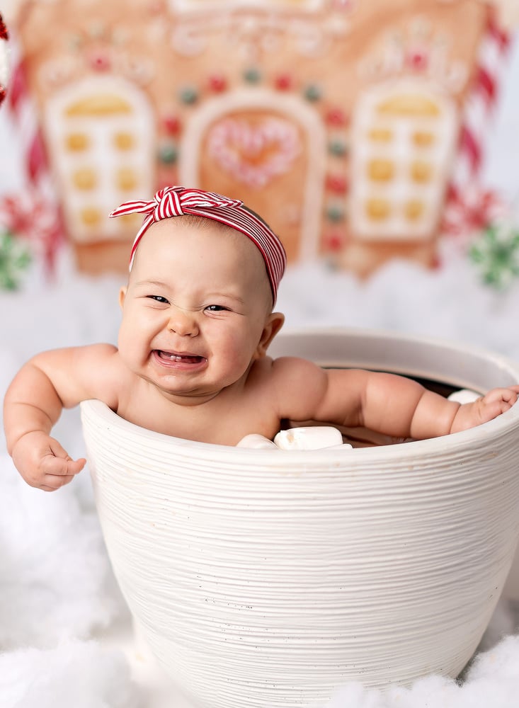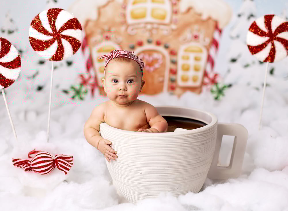 Adorable "hot cocoa" sessions feature an adorable gingerbread house backdrop, child-sized mug filled with a warm bath and giant marshmallows for your little one.